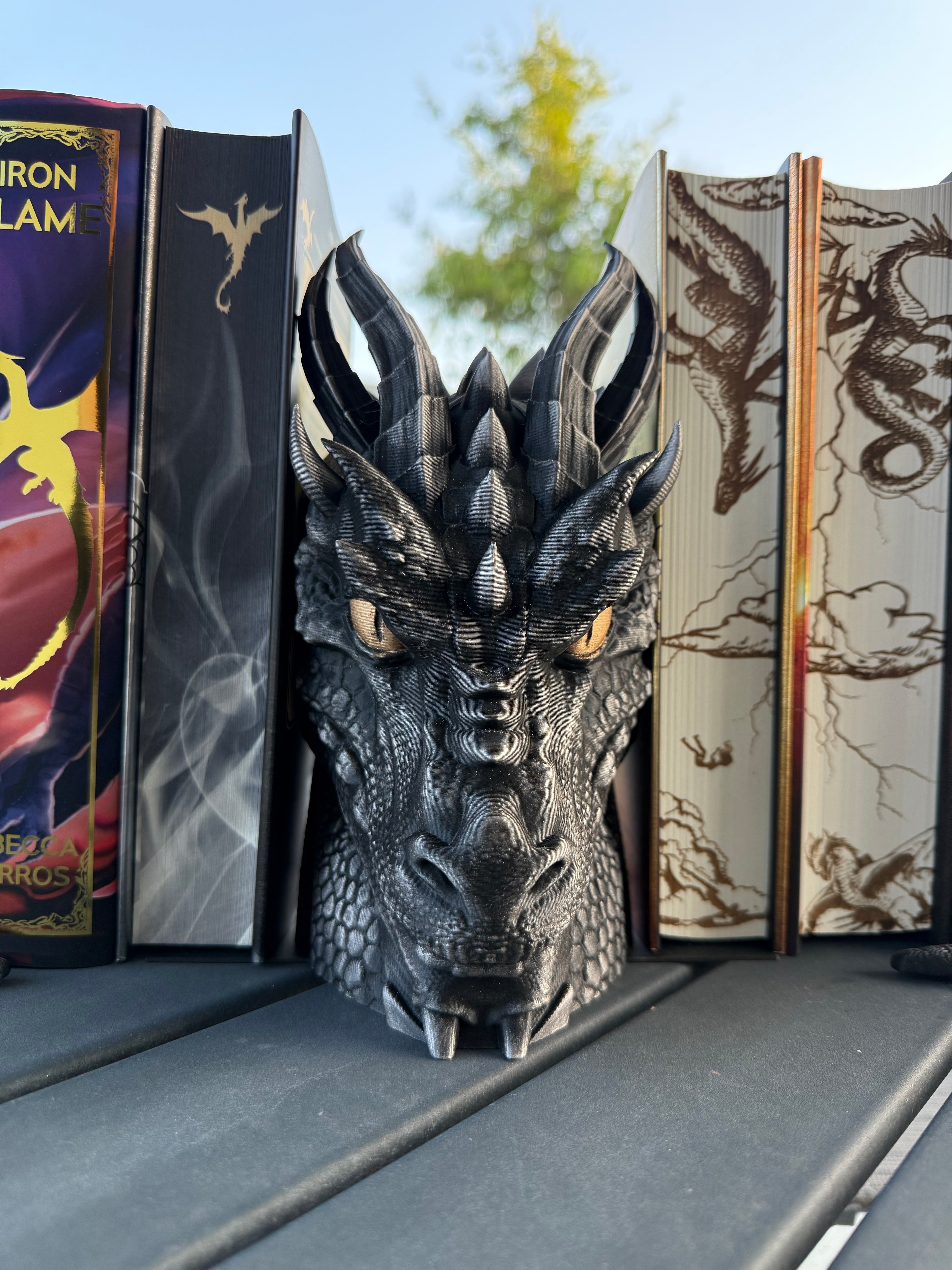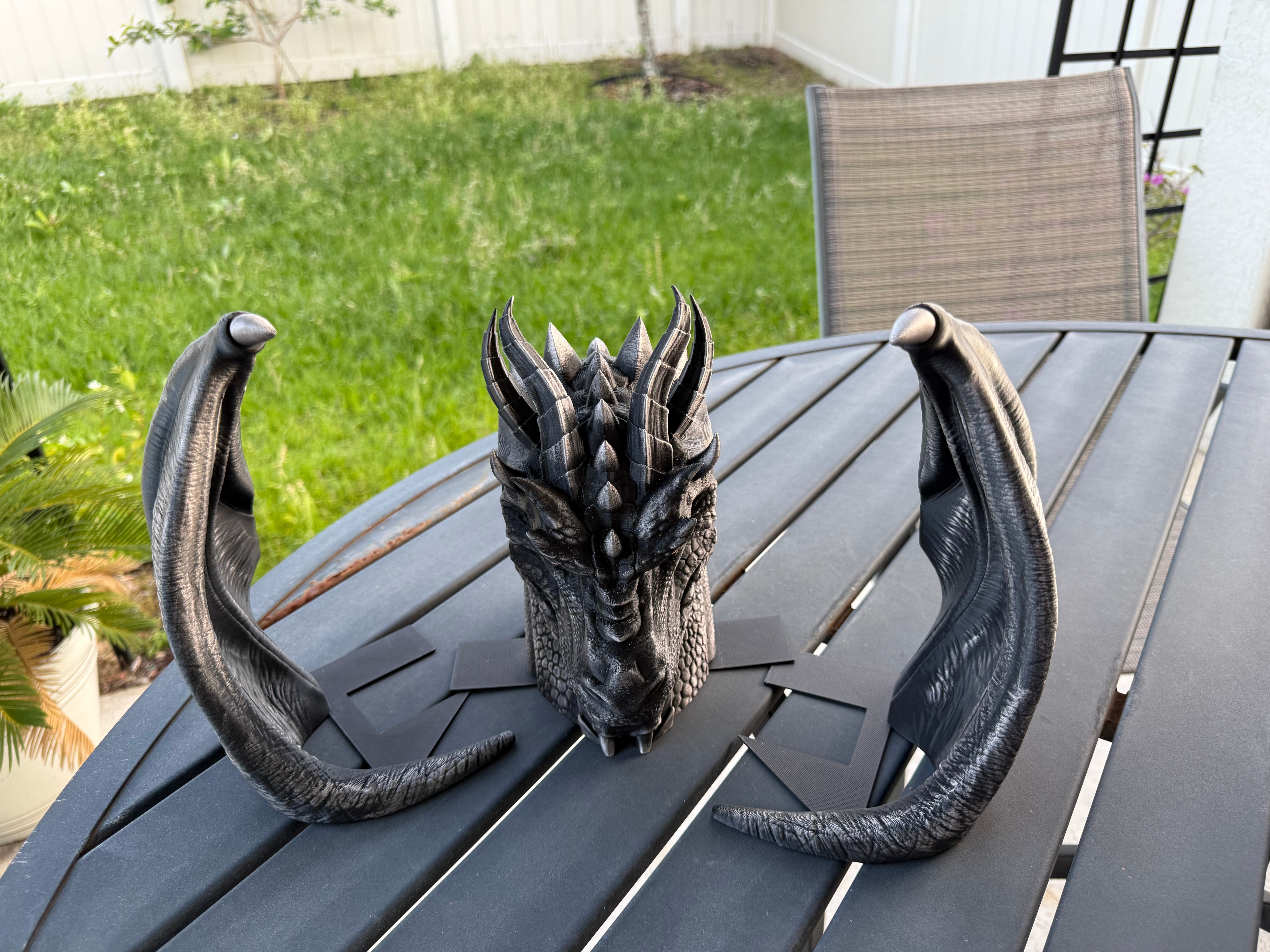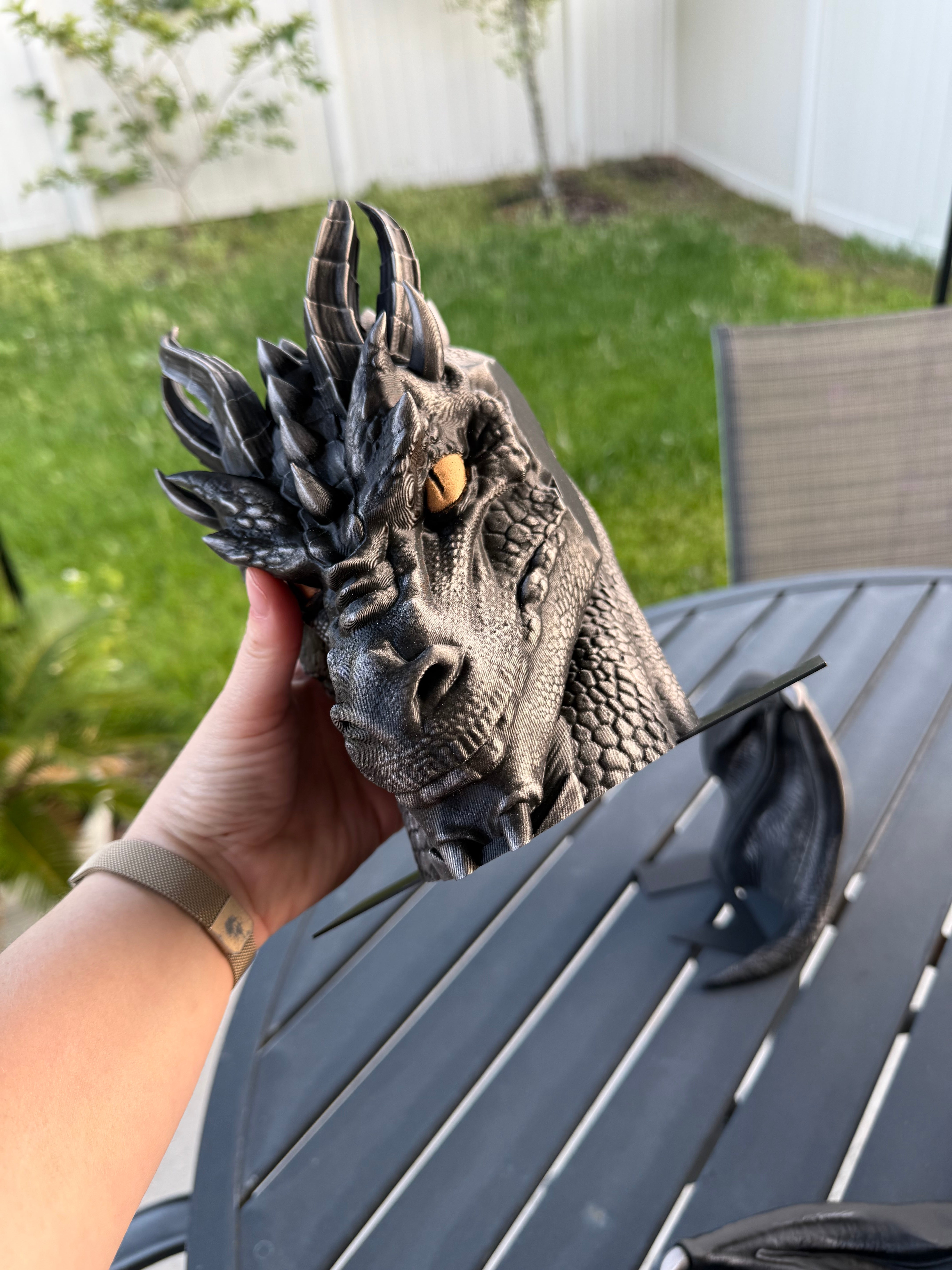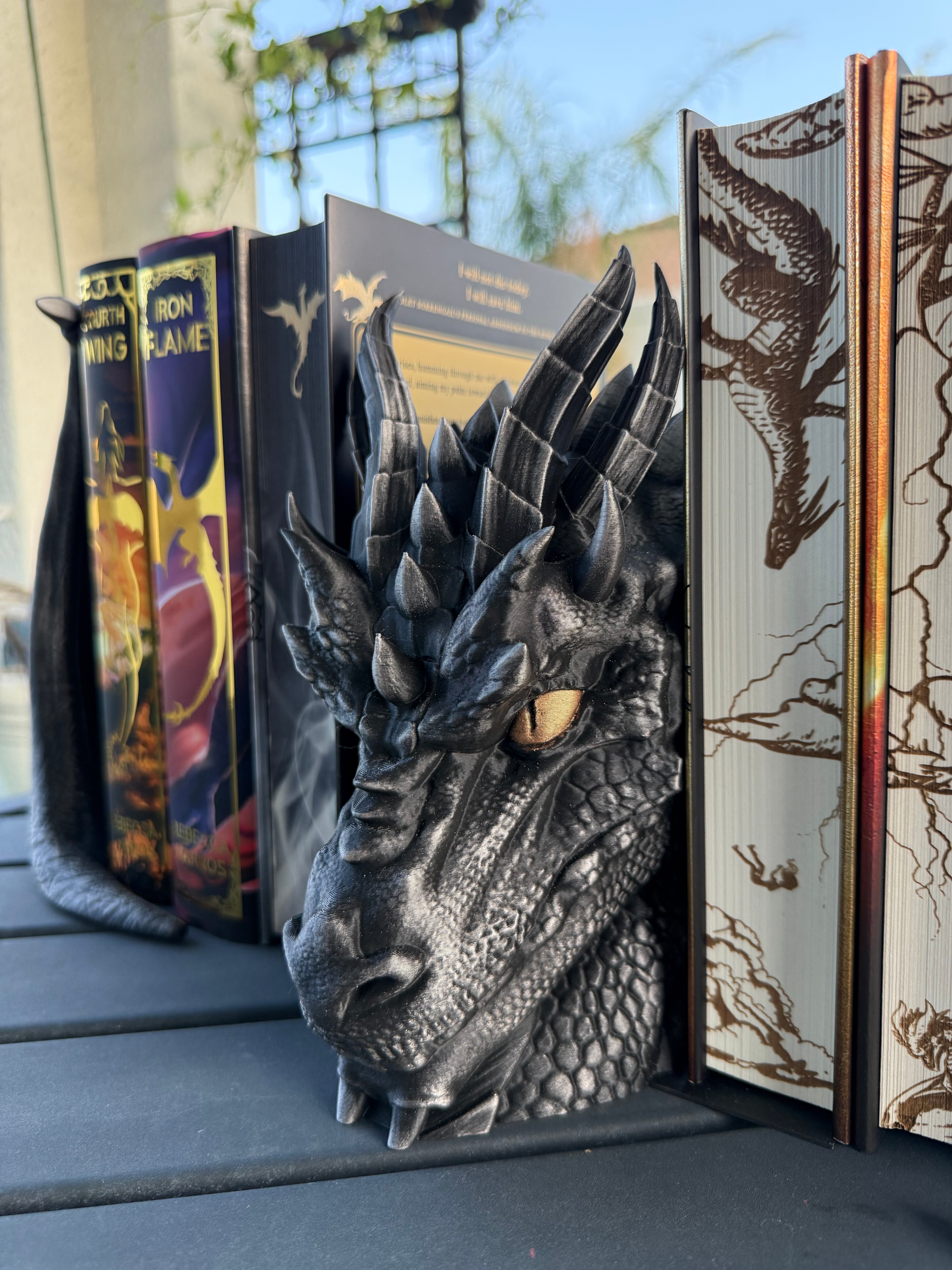Dragon is printed in Black with Pewter was finish, Gold finish for the eyes. I only have a few color options in the drop down menu because darker colors work best with the wax finish, but if there is any color you are wanting that's not listed, please reach out. :)